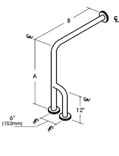 Grab bars have been designed and tested to withstand 1300 lbs. downward pull when properly installed. This exceeds HUD, HEW, FHA, VA, and other Federal, State, and local codes, including the Americans with Disabilities Act (ADA). Dimensions are measured from center-line to center-line of tubing, unless noted on grab bar application by circle dimensions which are from center-line of tubing to wall. Screws (not furnished).